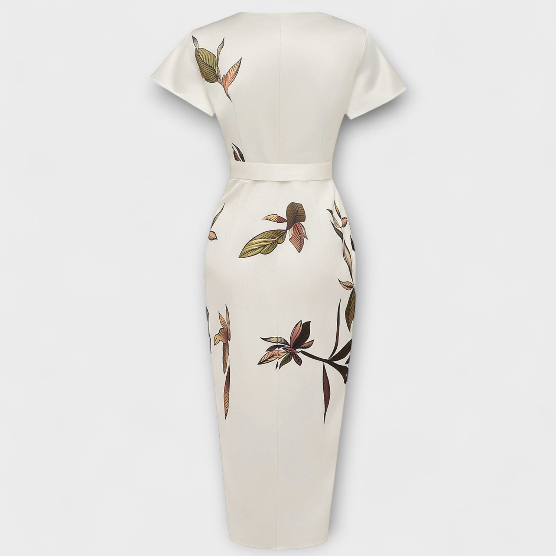 Encantador vestido midi envolvente con un vibrante estampado de hojas y un escote en V que favorece. Ideal para cualquier ocasión, desde brunches hasta eventos al aire libre.